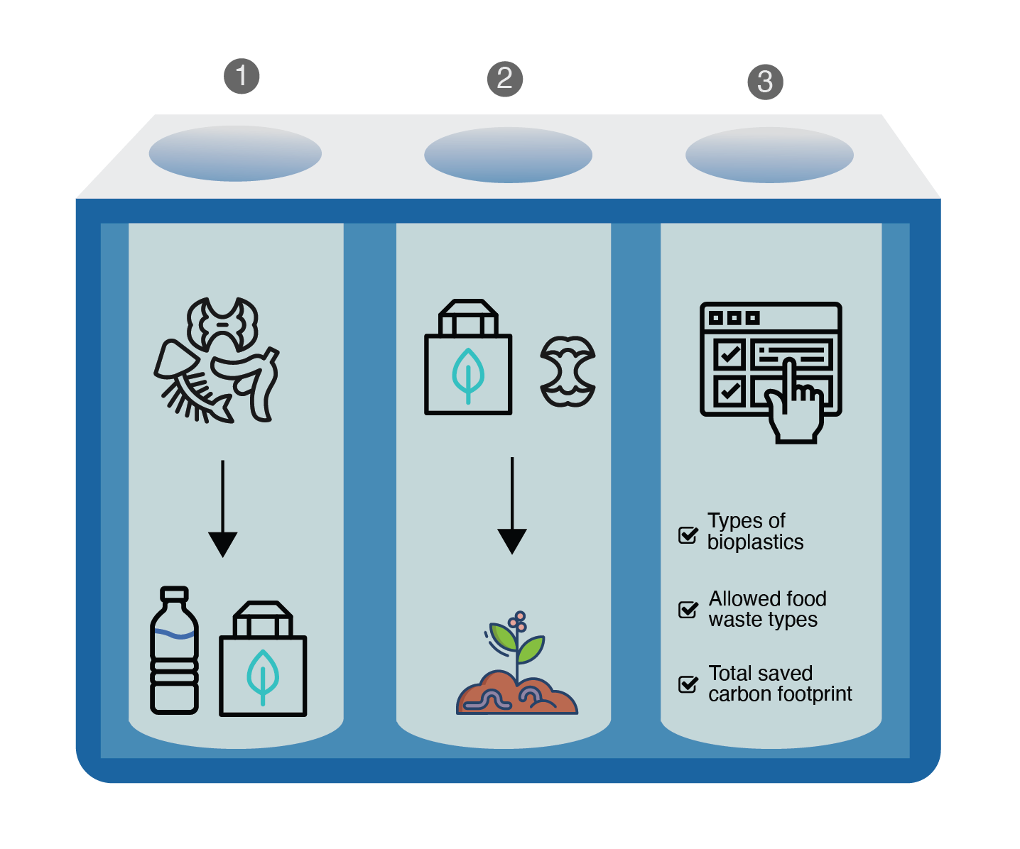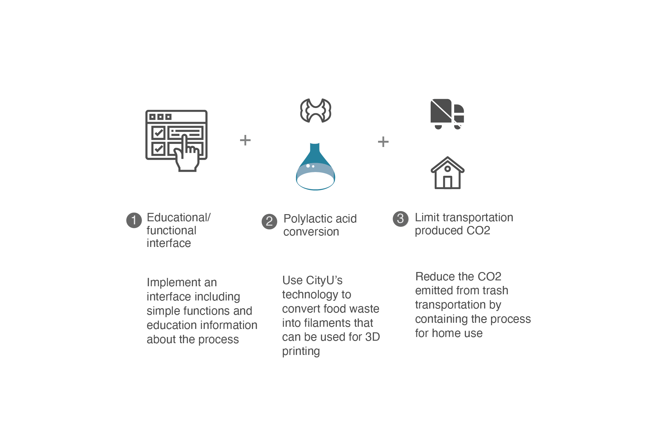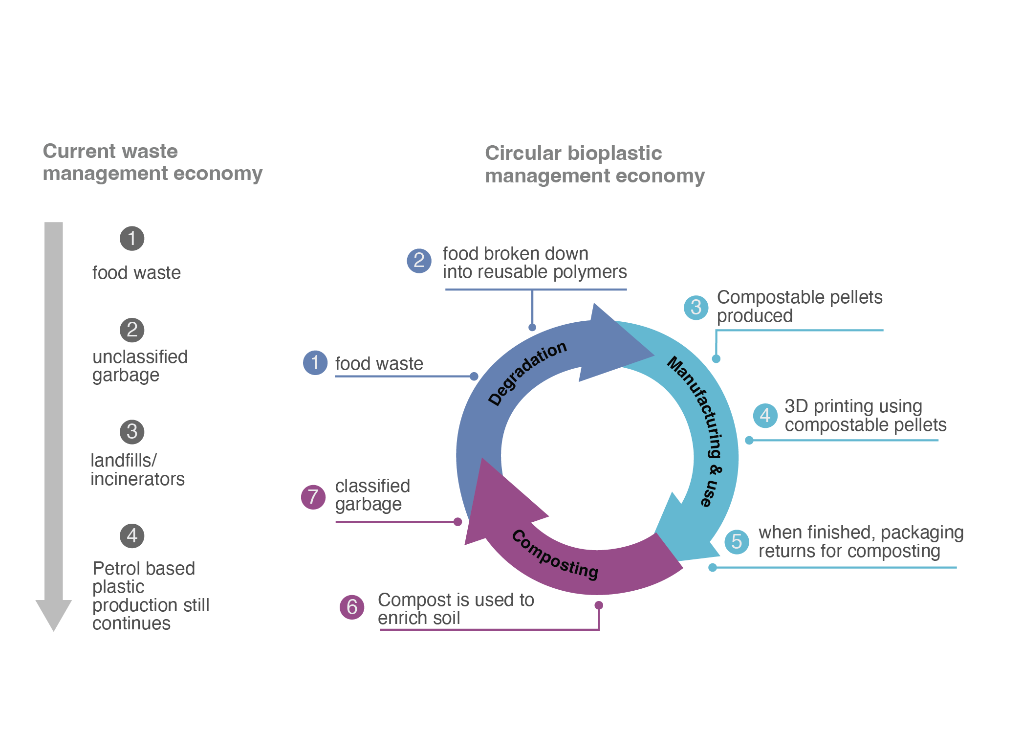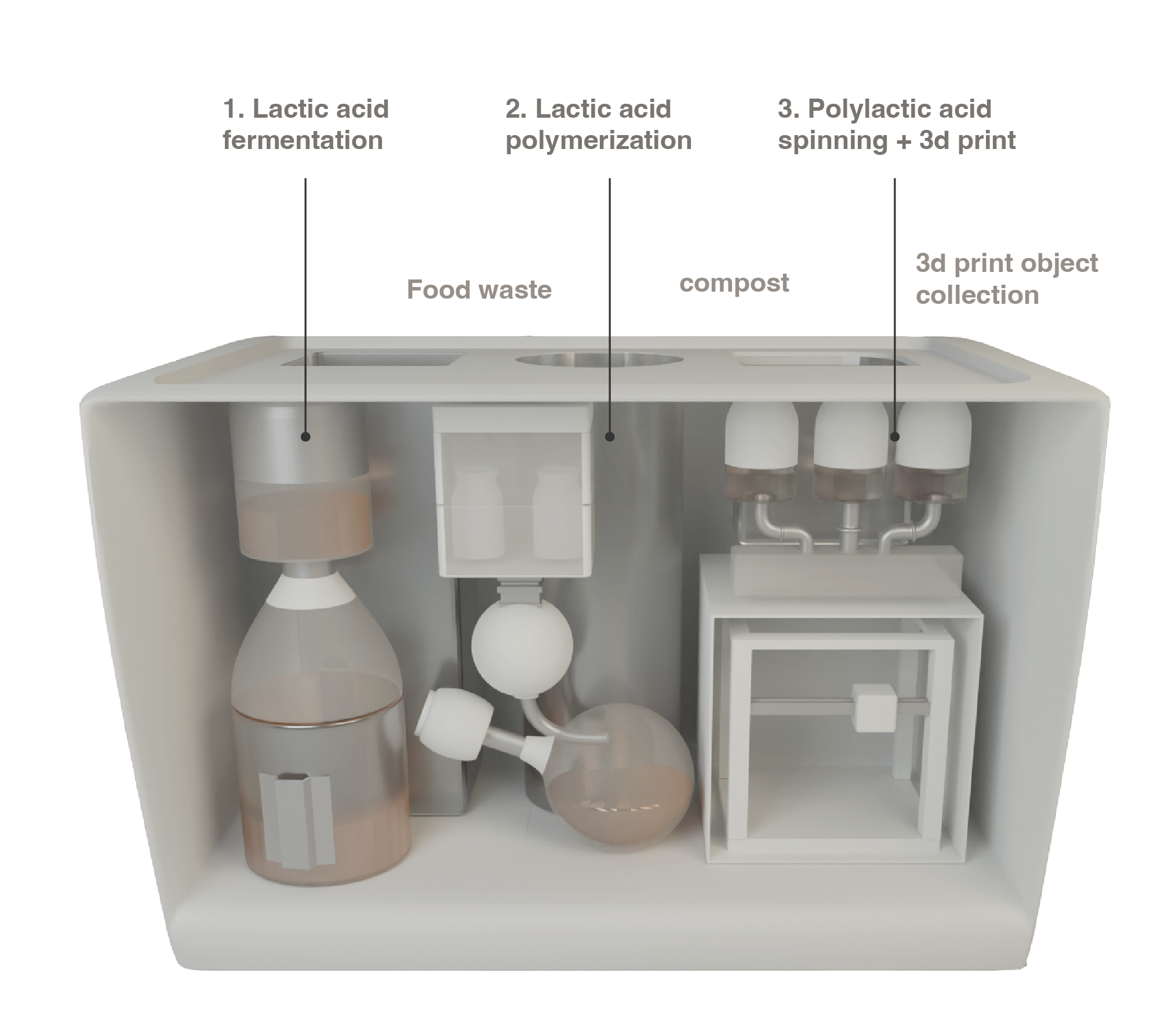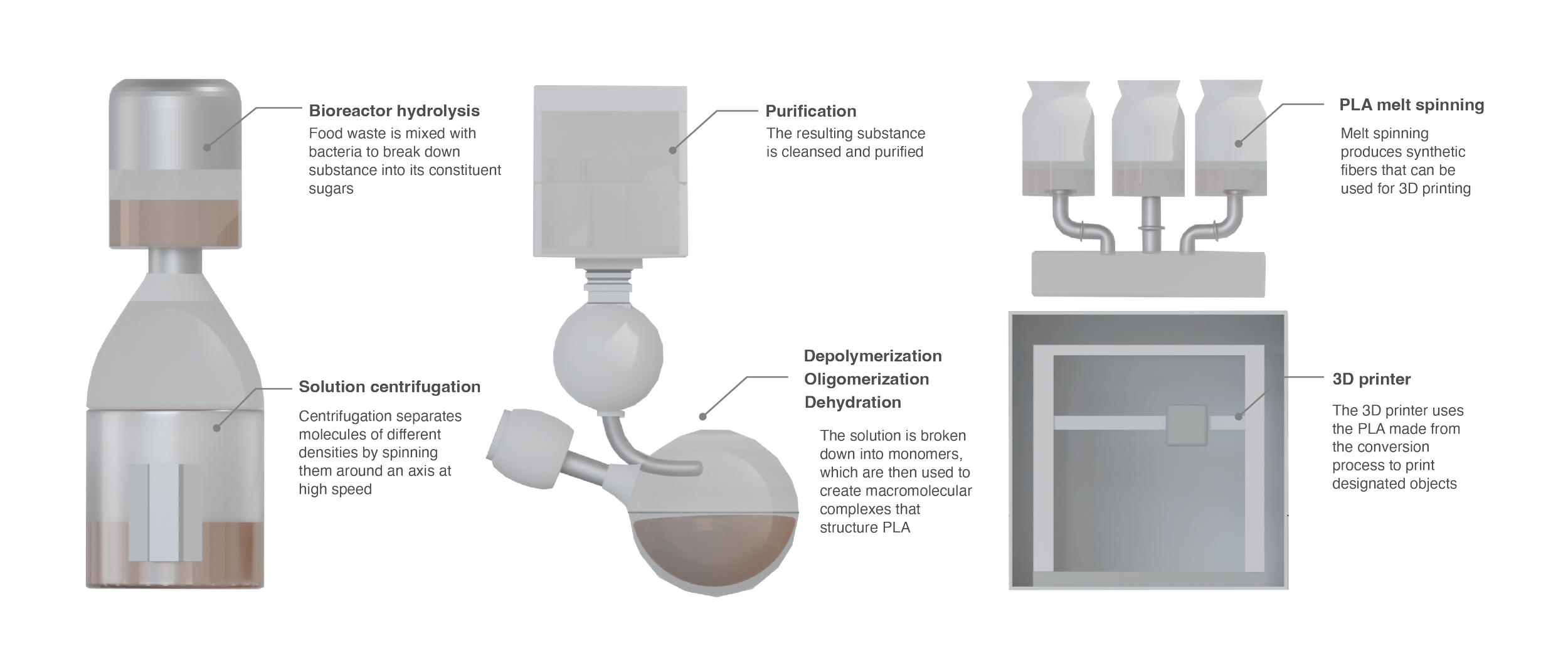 Convert food waste that include starch, including corn, rice, sugar cane, and beet into PLA which can be 3D printed into compostable plastic objects of the user’s choice.